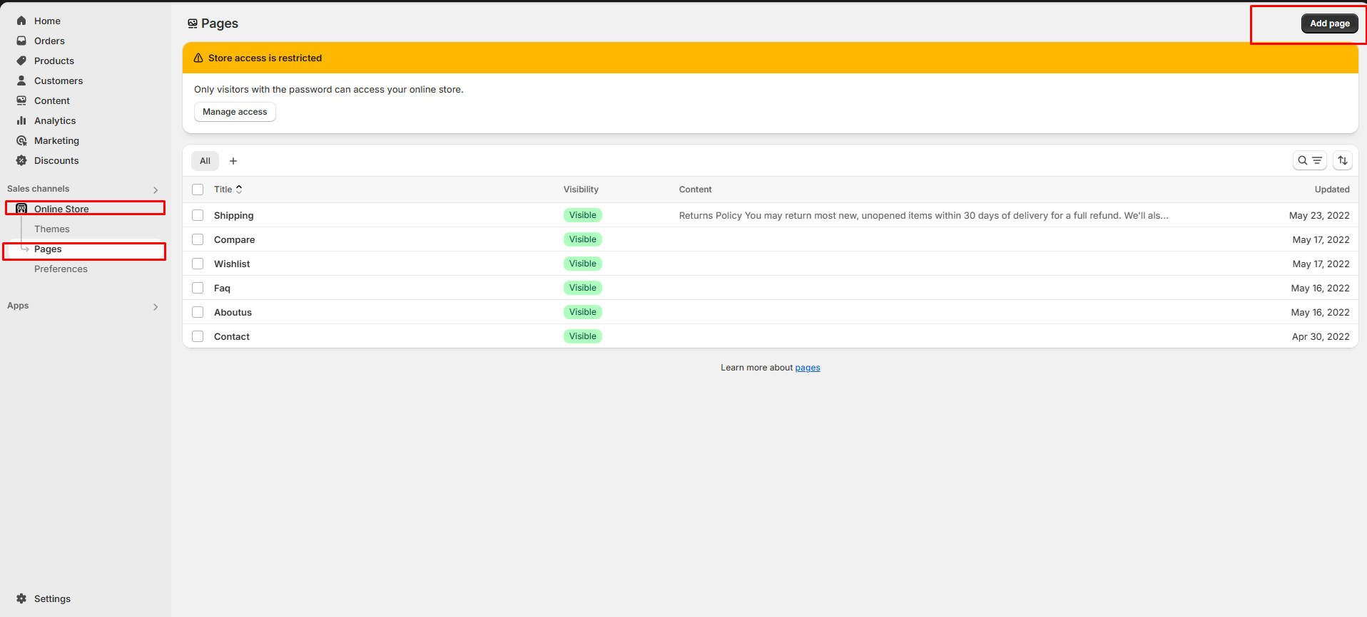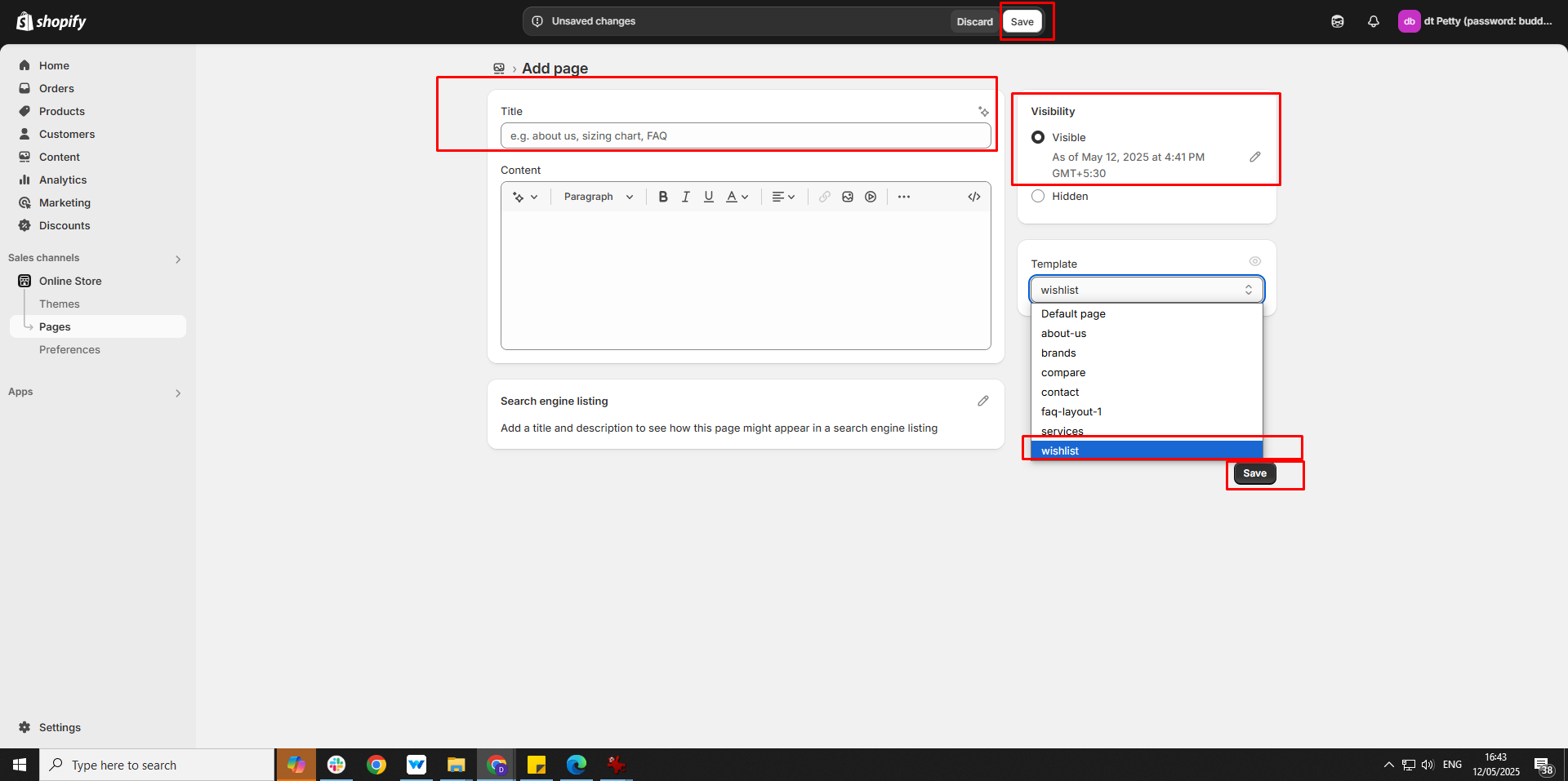 Step 4: Select Wishlist from the Theme template drop-down menu in the Online Store section.