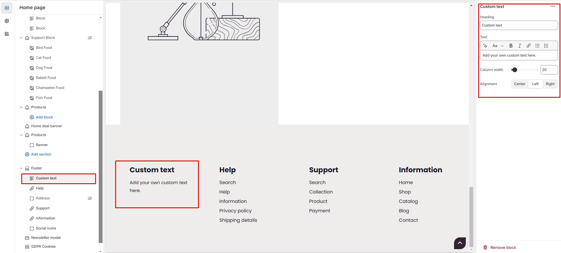 The Custom text Block in the Footer Section allows you to add custom text and store details, making it ideal for sharing contact information, brand messages, or store policies.