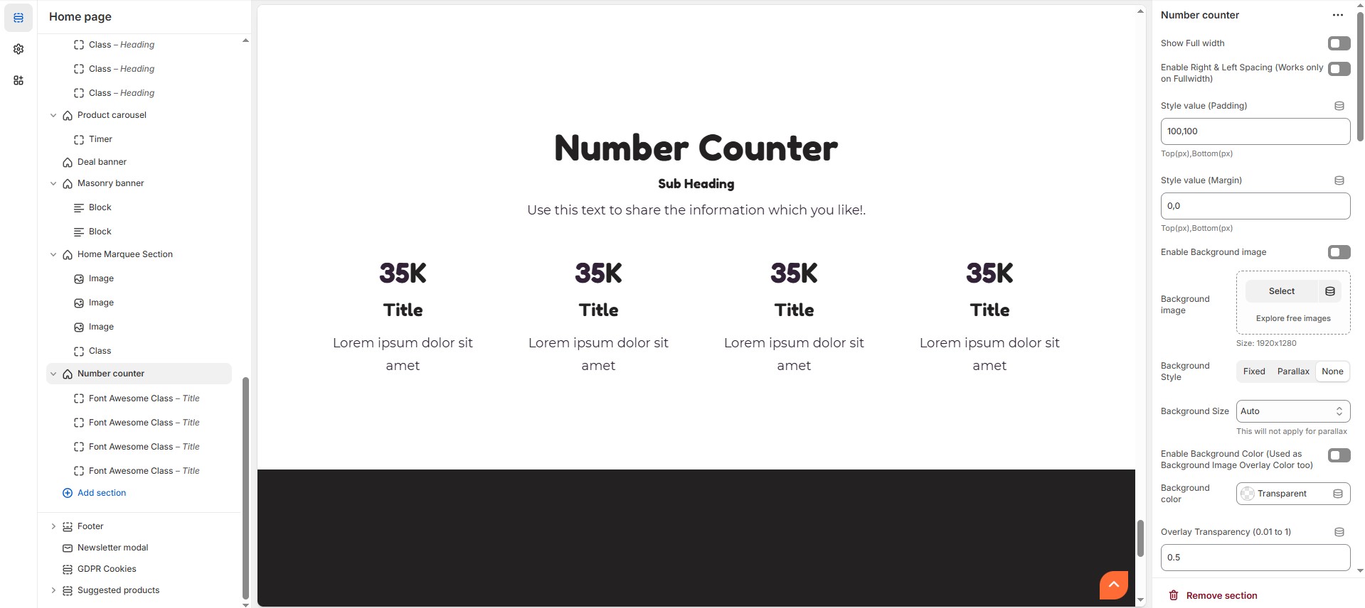 * In the Theme Editor, click **Add Section > Number Counter**.