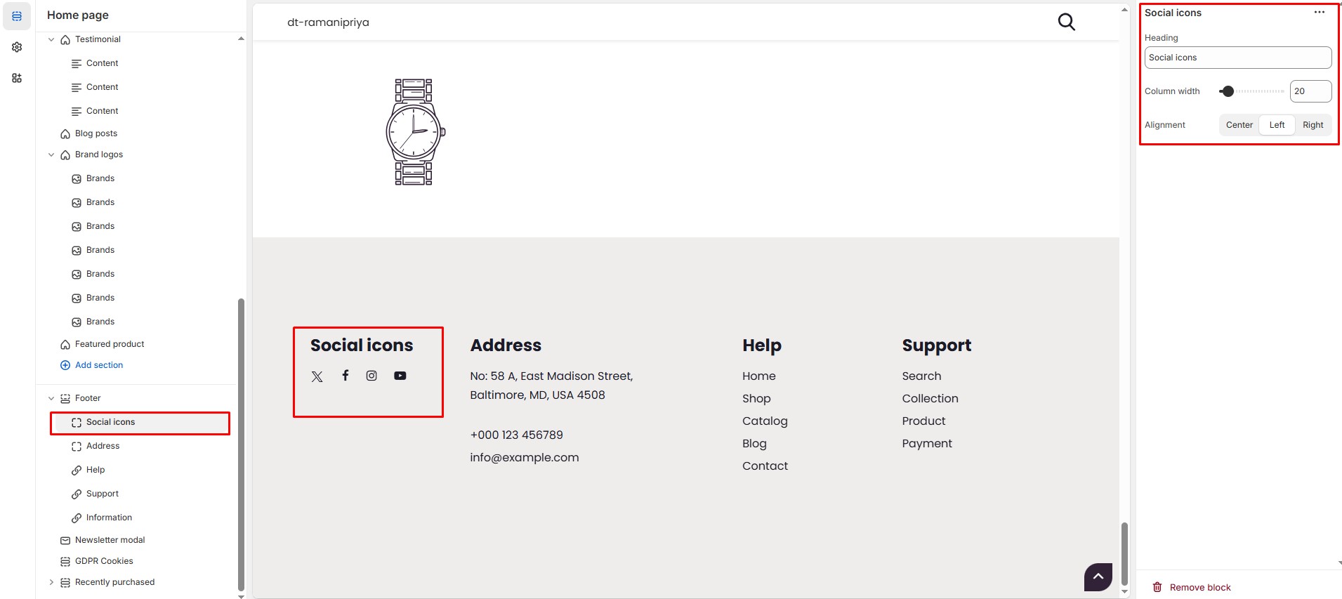 The **Social Icons Block** in the Footer Section allows you to display links to your social media profiles, helping visitors easily connect with your brand on various platforms.
