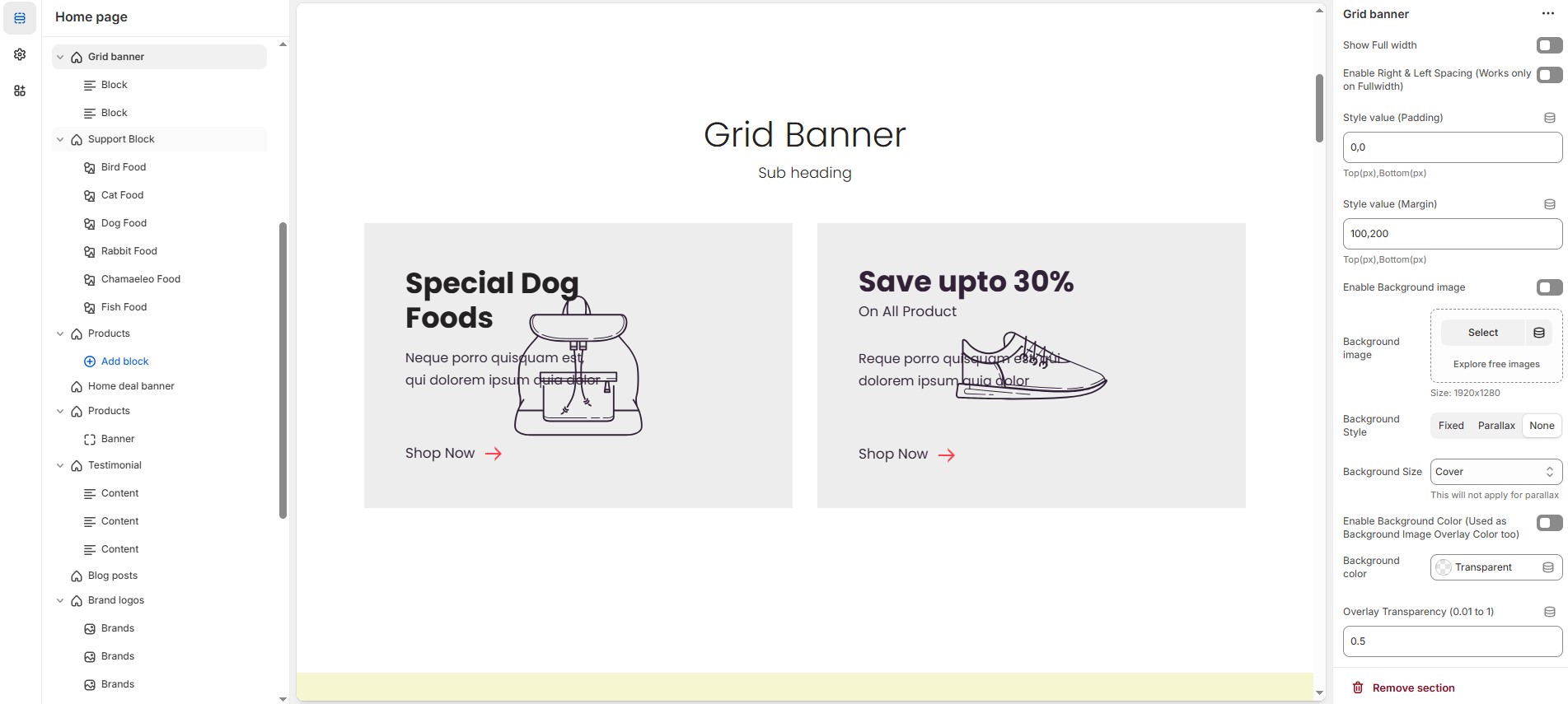 The **Grid Banner Section** allows you to display multiple banners in a structured grid layout, making it ideal for showcasing promotions, featured categories, or brand messages.