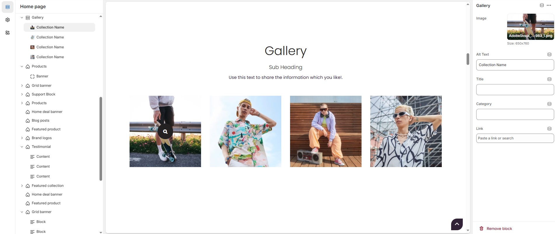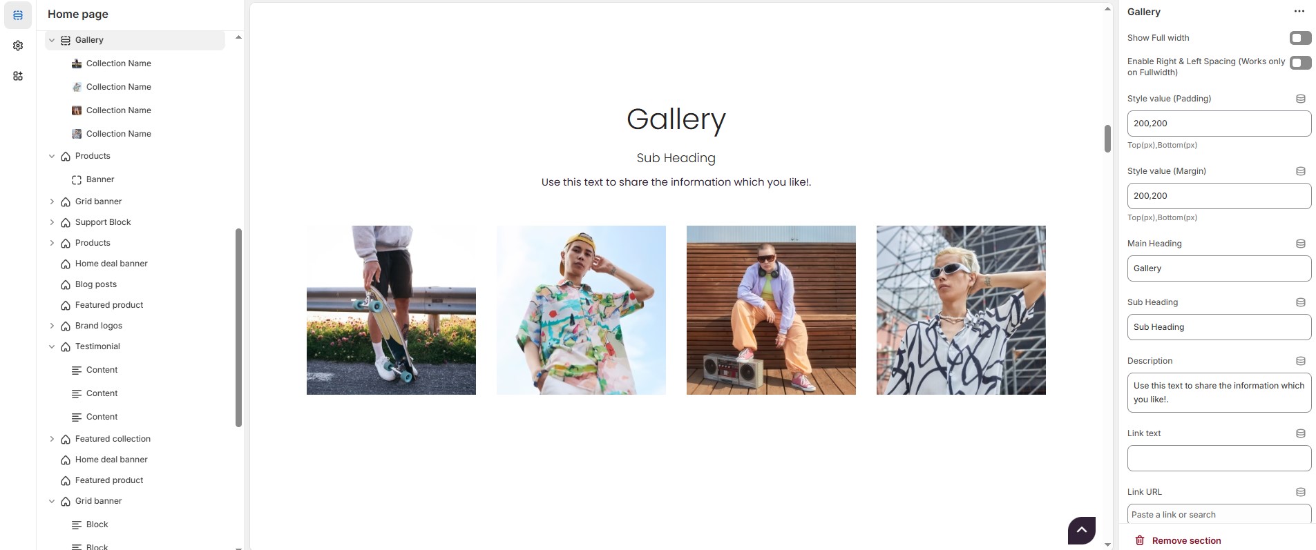 The Gallery Section in Shopify allows you to display images in a visually appealing format. It's ideal for showcasing products, brand visuals, or customer highlights. You can customize layout, colors, overlays, and add interactive elements for a better user experience.