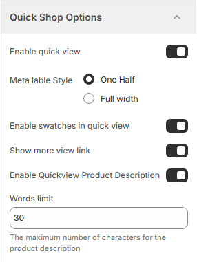 The Quick Shop Options settings allow users to configure the Quick View feature, making it easier for customers to preview product details without leaving the current page.