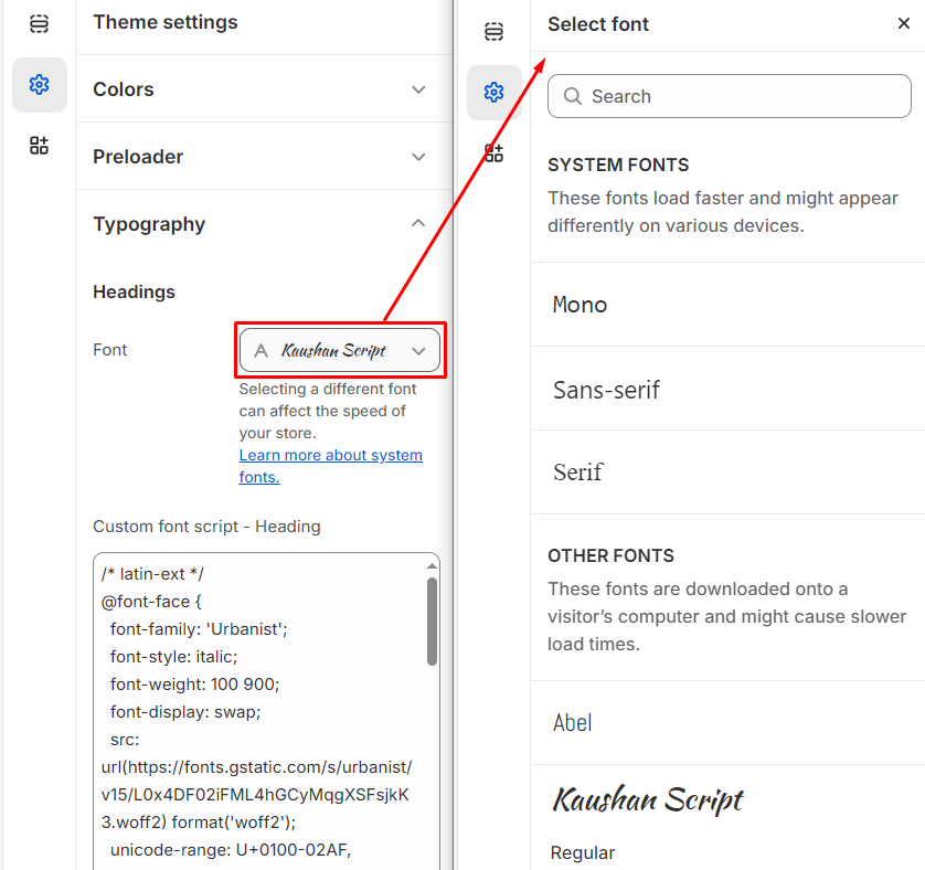 Follow the steps to embed the desired font in Theme Settings, selecting the text section you want to apply it to.